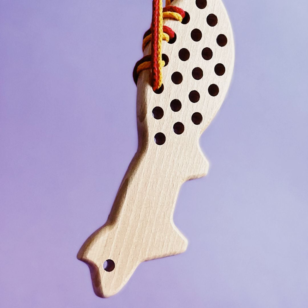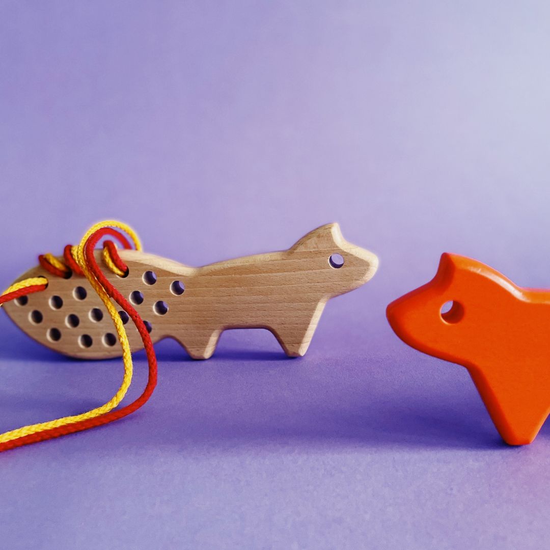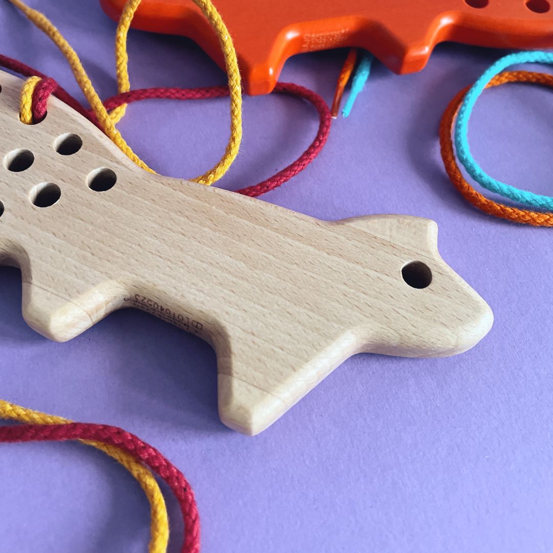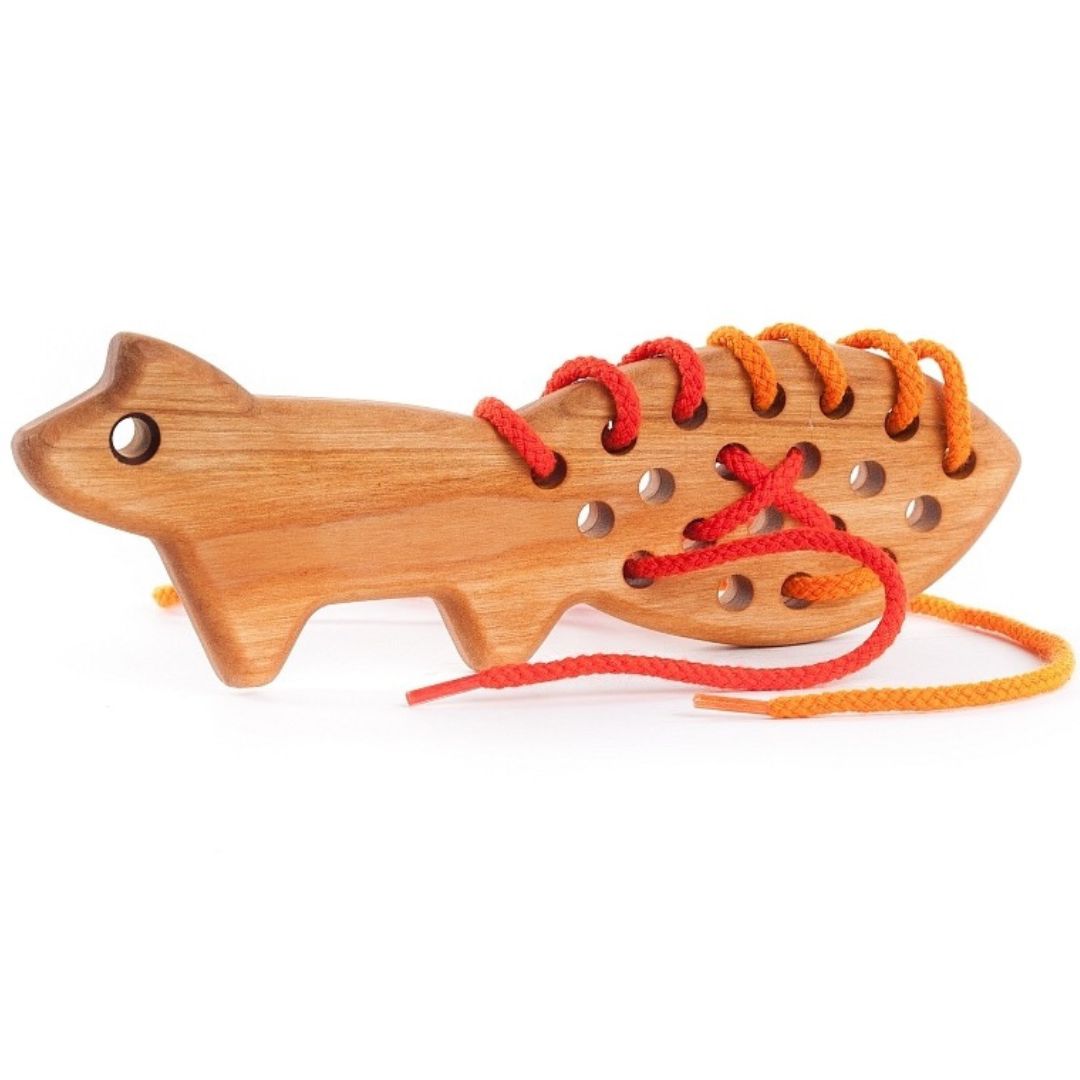 Drewniana przeszywanka w kształcie liska to propozycja dla dzieci, które lubią działania manualne i spokojną, angażującą zabawę. Przewlekanie sznurka przez otwory pozwala dziecku samodzielnie tworzyć układy i wzory, jednocześnie ćwicząc precyzję ruchów dłoni oraz koordynację ręka–oko.