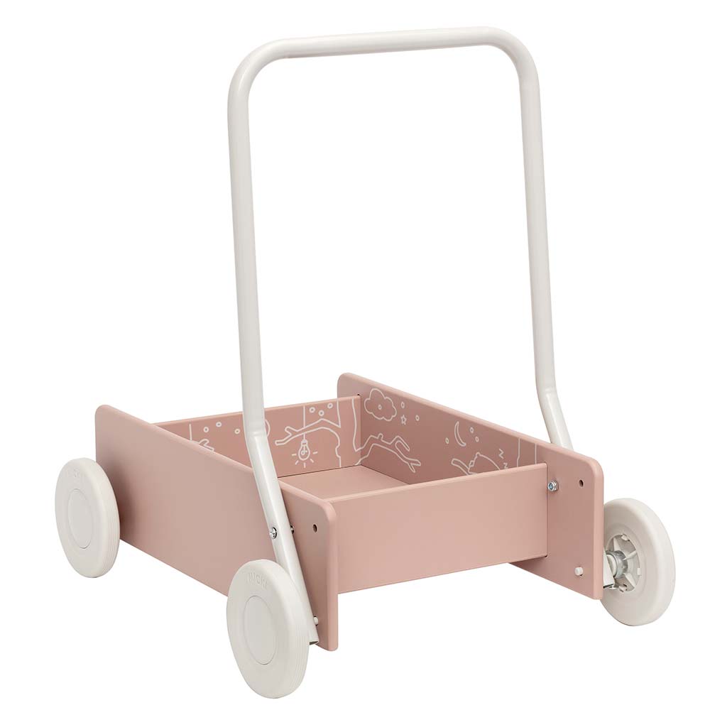 Dziecko podczas nauki chodzenia może zabrać swojego ulubionego misia na spacer w wózku lub przewozić klocki. Klasyczny chodzik Micki jest ozdobiony inspirującymi ilustracjami, dzięki czemu stanowi nie tylko narzędzie wspierające rozwój ruchowy, ale jest także kreatywną zabawką, która kieruje malucha w podróż pełną wyobraźni.